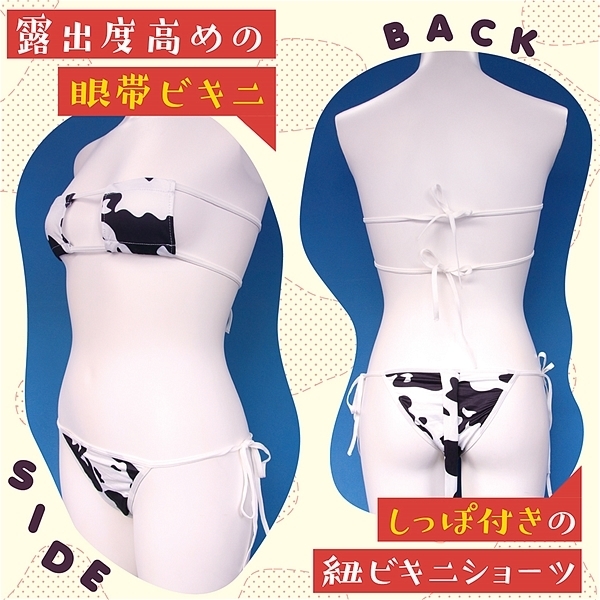 大胆でセクシーな牛柄コスチュームで野生の魅力を解き放て!あなたの中のメス牛が疼きだす、露出度高めの眼帯ビキニとしっぽ付きの紐ビキニショーツ。●メーカー型番:TMT-1711