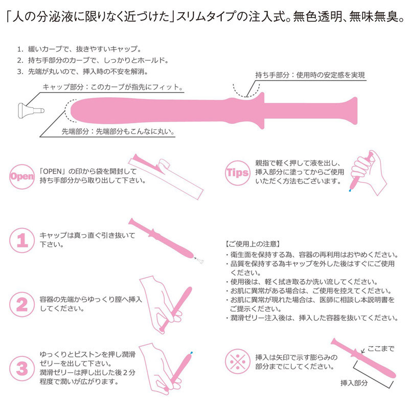 濃密でハッピーな二人のラブタイムに!気分や体調によって濡れづらくなってしまうデリケートな女性の為に作られた、注入型の潤滑ローション(30本入)。注射器型のノズルで内部に注入できるから衛生的!ヒアルロン酸などを配合した分泌液に近いとろけるゼリーで、最後までパートナーにバレる心配はありません。痛い・気まずいには今日でサヨナラ!洗い流しも簡単にできる注入型ローションです。