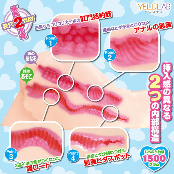 圧倒的没入感!リアルなむちむち生粘膜感を味わえるスカート付きヒップホール「ミニスカっと!姉のアンブレラプリーツふわり 〜1500グラムのセクシーヒップ〜」。重量1500gで取り扱いやすい中型サイズのボディは外側と内側で弾力と肌触りの違う2WAY幼熟2層構造を採用し、異なる挿入感を実現。内部は机に置いても床に置いても腰振りでリアルな締まりを体験できる二穴構造です。アナル側は密集するコリコリ大イボの肛門括約筋とまとわりつく繊細なヒダがお出迎え!ヴァギナ側は曲がりくねった3連イボの膣道と極細ヒダが締めつけます。アンブレラプリーツスカートを身に着けたままの着衣セックスが楽しめるリアル造形のオナホール。保管に便利な専用ケース付き。