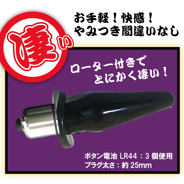 コンパクトなのでお手軽で快感なア○ル用プラグ。突き刺さるおもてなし。ローター付きでとにかく凄い。ボタン電池3個、交換可能。色:黒