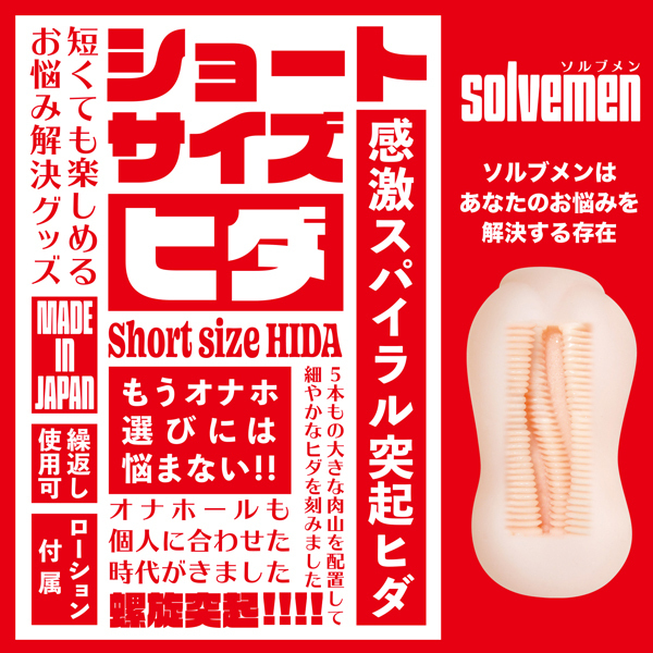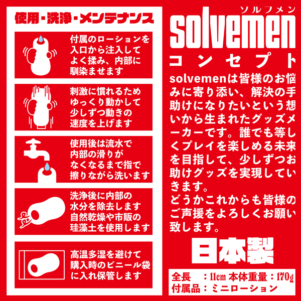 突起ヒダが螺旋状に続くスパイラル構造!全長11cm、繰り返し使えるショートサイズの日本製オナホ(非貫通)♪全ての人のお悩みに寄り添い解決したいという思いから開発された「ソルブメン」。短い人も長い人も楽しめるように2種類のタイプをご用意!「どれを選んでいいか分からない」というお悩みを、このソルブメンが解決します。ミニローション付