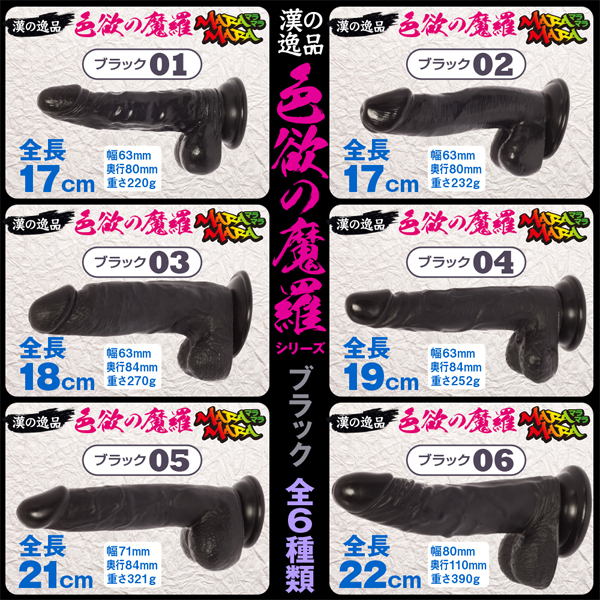 maccos japanのディルドブランドMARAMARAから【色欲の魔羅シリーズ】の登場です。サイズ的にもフォルム的にもスタンダードなタイプで、少し上反り気味だからスポットを狙いやすいかもです!全長17cm、最大径3.5cm、挿入長12cm。ブラックカラーの色欲に溺れるリアルな外観と感触がたまらない!本物志向のスタンダードなディルドです。01は先端が上方に反り立ち、ナカのGスポット責めに最適。適度な弾力と硬さを兼ね備え、本物以上の質感は貴女を虜にすることでしょう。床、壁、浴槽とどこにでも張り付く強力吸盤付きで楽しむ場所を選びません。初心者から上級者までしっかりと楽しむ事が出来ます。