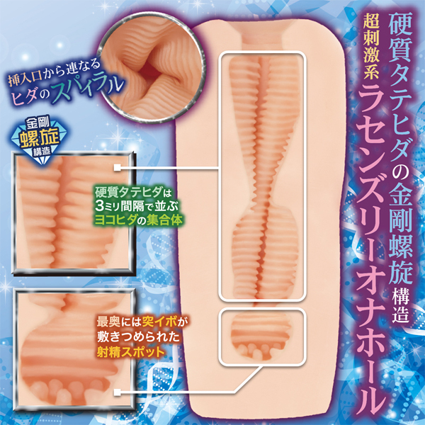 螺旋でせんずり、それがラセンズリー!ダイヤモンドラセンズリーは、4本の硬質タテヒダが「螺旋でうねる」高刺激スパイラルオナホールです。螺旋でうねる硬質タテヒダの正体は「3mm間隔ヨコヒダ」の集合体。この仕様により「タテでの螺旋の刺激」と「ヨコヒダのまとわりつく刺激」が挿入口から連なり「複雑なうねり刺激」が発生。最奥に配置された「突イボ」スポットへの到達で緩急ある快感となり、深みのある使用感のオナホールとなっています。ボディは「螺旋の刺激をMAX」で伝えるために「オクタゴン(八角形)造形」を採用。8つのエッジが内部の4本の硬質タテヒダをピンポイントで押しつけ、螺旋の快感を逃しません。全長150mmのミドルタイプですので、ストロークの時に「先端がしな垂れる」ことなく、真っ直ぐなフォルムをキープ。ストレートな螺旋の刺激を余すことなくお楽しみいただけます。保管に便利な専用ブリスターケース、オリジナルローション付属。非貫通のオナホール