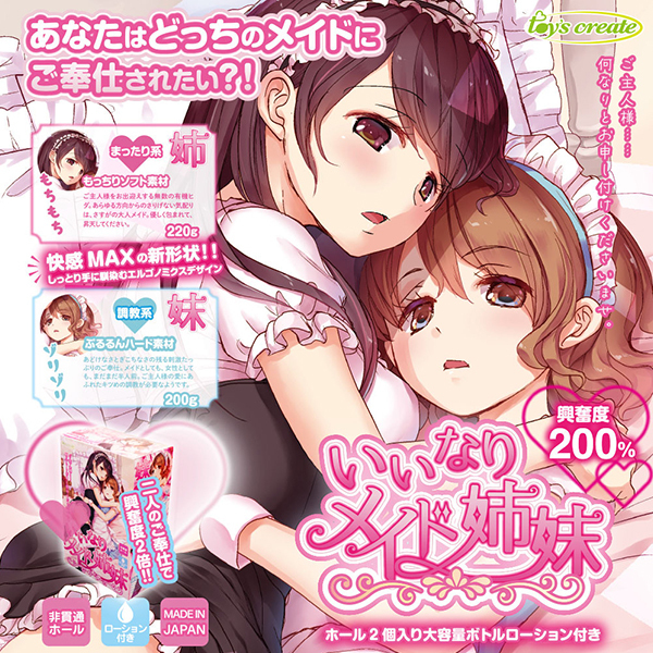 ホール2個入り!大容量ボトルローション付き(姉)もっちりソフト素材。ご主人様をお出迎えする無数の有機ヒダ。あらゆる方向からのさりげない気配りはさすがの大人メイド。優しく包まれて昇天してください。(妹)ぷるるんハード素材。あどけなさとぎこちなさの残る刺激たっぷりのご奉仕。メイドとしても女性としてもまだまだ半人前。ご主人様の愛にあふれたキツめの調教が必要なようです。