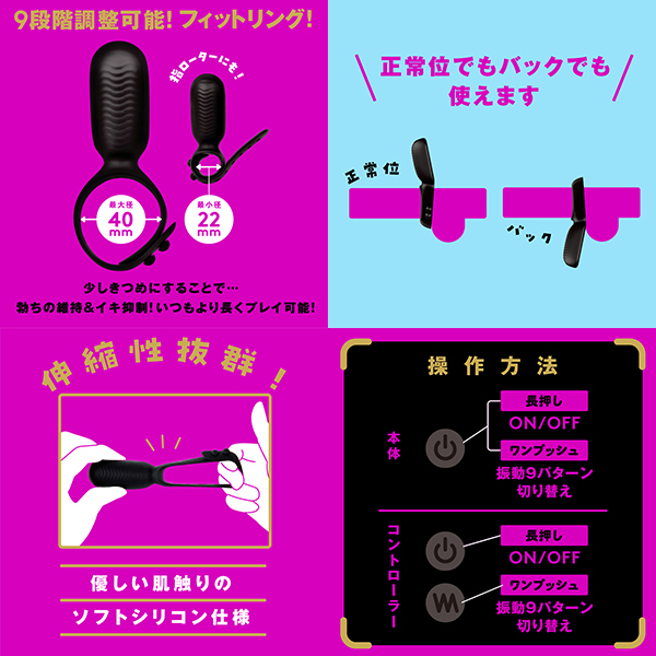 あの子の感度が爆上がり夢の同時イキができちゃうカップル用ローター!自分のサイズに合わせて調整できるフィットリングは9段階調整可能!ベルト式なのでプレイ中の着脱もラクラク!伸縮性バツグンで肌触りも優しい高品質ソフトシリコン仕様!9パターン振動のハイパワーローター搭載で激しい夜になること間違いなし!遠隔操作可能なコントローラー付きなので、プレイ中の振動パターンの切り替えが簡単!プレイ中も重さが気にならないように軽さにもこだわりました。9つ振動パターン&完全防水IPX7等級&充電用USBケーブル付属。充電時間:約80分。連続可動時間約20〜30分。