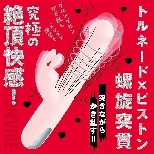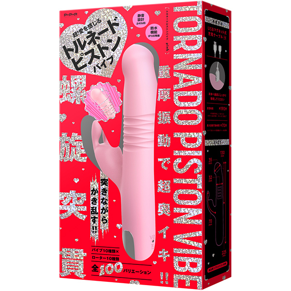 突きながらかき乱す《螺旋突貫》による究極の絶頂快感!トルネードとピストンが併せ持つ超強烈ギミックでグルングルンかき乱しズンズン深突き!ぷにっとカリヘッドが肉壁を気持ちよく擦りあげ!超強力重厚モーターで芯から震える重くて強烈な振動で奥イキ!!バイブ:10種類×ローター10種類の全100バリエーション♪ 肌ざわりなめらかな高品質ぷにっとソフトシリコン仕様。肉壁を挟み込む心配がない柔らかピストンギミックです。本体は充電式なのでエコに使用可能。本体:充電時間約190分、本体:最大連続稼働時間約70分(初期振動パターン未変更時)_IPX6等級_バイブ・ローター各10パターン振動_付属品:USBマグネット式充電ケーブル※IPX6:放水ノズルを使って噴流水を最低3分間あてる試験(浸水は不可となります)●カラー:ピンク