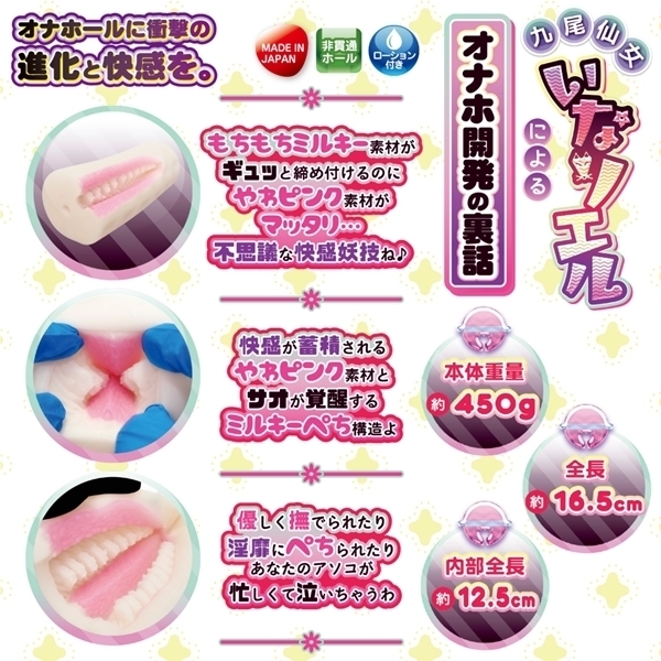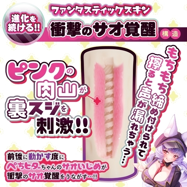 狐仙女による新たな刺客が届いた!それは「サ〇覚醒!ビラぺち子」である。サ〇覚醒という何やら怪しげな技を用いて作られたこのオナホールはスゴイ!!その名の通り、サ〇の覚醒に一直線。他の事には目もくれないのである。妖界ではこの現象を「サ〇まっしぐら」と呼んでいるとかいないとか。では何がサ〇を覚醒させるのか?それは素材と構造の絶妙な組み合わせである。もちもちミルキー素材はサ〇を的確にこすり高めるベスト硬度であり、これ以上でも以下でもサ〇の感度は急上昇を見込めないであろう。そんな絶妙すぎる硬度から生み出される「ぺち構造」。これが辛抱たまらん状態を30秒に1回は生み出すとか…。これに耐えられる人間のオトコはいるのだろうか…。連続ぺちに疲弊しないようピンクのやわ素材でバランスを取るあたり、いなりエルお姉さまの優れたオナホ妖技が見て取れるのであった。嗚呼、いなりエルお姉さまの声が聴こえる…。「こ〜んなにサ〇を覚醒させちゃって…(笑)ほ〜らおイキなさい!」